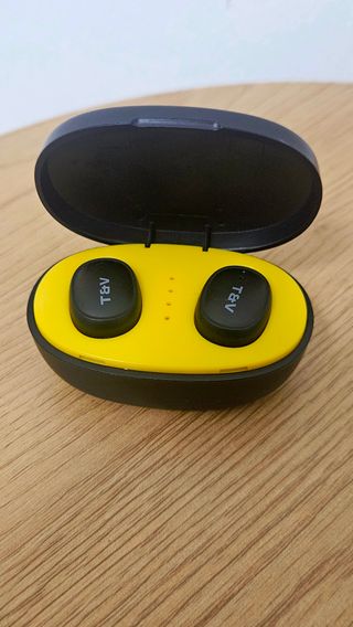 Auriculares inalámbricos E7S con diseño moderno y compacto. - Versión inalámbrica: 5.3 - Incluye caja de carga y diseño dividido para los auriculares. - Acabado en negro y amarillo.