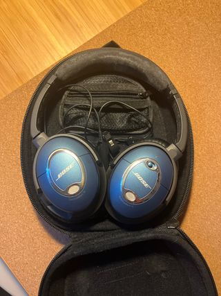 Auriculares Bose QuietComfort 15 en color azul y gris. Incluyen su funda protectora. -los auriculares suenan de miedo, la marca es buenisima, la cosa es que se ha abierto la almohadilla y ya tengo otros y no quiero comprar el recambio en amazon. Me costaron 250€ pero como estan muy desgastados los dejo a ese precio, pero suenan como el primer dia. Pueden conectarse por cable o por bluetooth