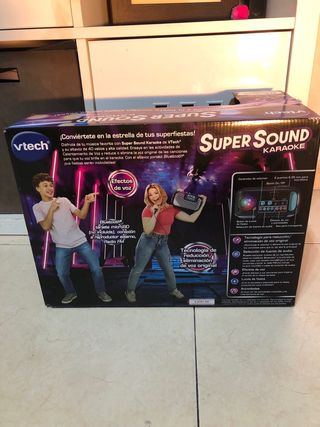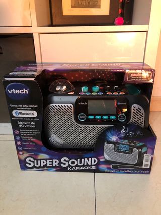 Altavoz de karaoke VTech Super Sound con tecnología Bluetooth. Ideal para fiestas y para disfrutar de la música. - Altavoz de 40 vatios. - Reproducción de audio sin cables. - Reduce o elimina la voz original de las canciones. - Selección de fuente de audio. - Efectos de voz. - Luces de fiesta. - Actividades. - Incluye micrófono con cable.