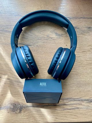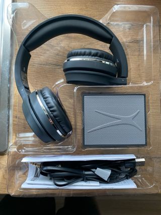 Auriculares y altavoz Bluetooth en color negro y plateado. - Diseño moderno y elegante. - Conexión inalámbrica Bluetooth. - Incluye cables y manual.
