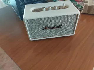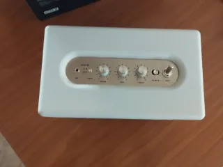 Altavoz de la marca Marshall en color beige y plateado. Un diseño elegante y compacto. - Controles de volumen, graves y agudos. - Interruptor de encendido/apagado. - Entrada auxiliar.