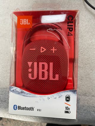Altavoz inalámbrico portátil JBL Clip 4 en color rojo. Diseñado para ser enganchado y llevado a cualquier parte. - Resistente al agua y al polvo. - Clip integrado para sujetarlo fácilmente. - Conexión Bluetooth v5.1. - Hasta 10 horas de reproducción.