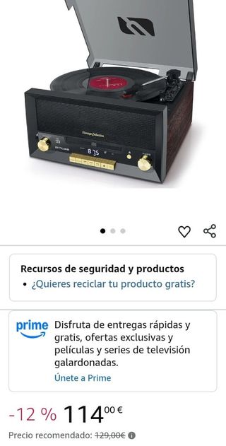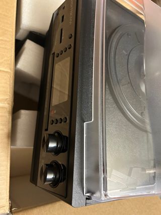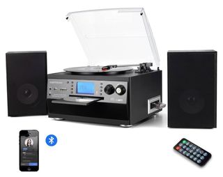 Sistema de sonido con tocadiscos y conectividad Bluetooth. - Reproduce vinilos. - Conexión Bluetooth para dispositivos móviles. - Puerto USB para reproducción y grabación. - Lector de CD y radio FM. - Incluye dos altavoces y mando a distancia. -CD, casete, radio -AM/FM y entrada auxiliar, puerto USB y codificación SD, control remoto, con altavoces estéreo independientes Nuevo