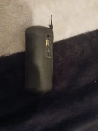 Altavoz portátil T&G con conexión Bluetooth. Se uso un par de veces hace años, está un poco sucio en una zona en concreto (última foto). No tengo el cargador. -Entrada de cargador USB tipo C. - Diseño cilíndrico. - Acabado en malla negra. - Detalles plateados en los extremos. - Base con dos soportes.