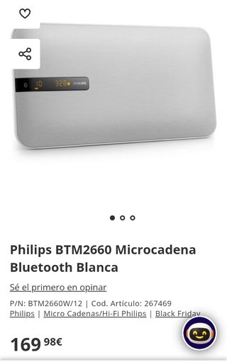 Dimensiones del producto: largo x ancho x alto13,2 x 49,4 x 34,4 centímetros Fuente de alimentaciónBatería La minicadena fina y compacta philips btm2660w/12, aparte de ser muy cómoda de usar, garantiza un fabuloso sonido potente y permite reproducir música en streaming de forma rápida y sencilla Otra de las grandes ventajas de esta minicadena philips es que puede acoplarse con 2 dispositivos móviles y reproducir su música a través de bluetooth; sácale el máximo partido a esta minicadena compartiendo música con familiares y amigos El sistema de altavoces bass reflex garantiza una excelente calidad de sonido creando graves inten...