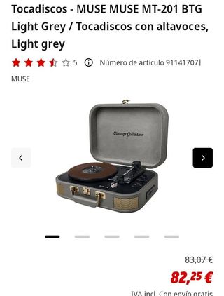 Muse MT-112W es un micro sistema de audio con diseño retro que integra giradiscos de 3 velocidades (33/45/78 RPM), reproductor de CD compatible con CD-R/RW, radio FM con 20 emisoras memorizables y conexión Bluetooth para reproducir música desde dispositivos móviles. Incorpora puerto USB y lector de tarjetas SD con función de grabación y reproducción MP3. Potencia de salida de 20 W RMS, sonido nítido y envolvente. Construcción tipo correa para el plato, incluye tapa protectora antipolvo. Dimensiones aproximadas 343 × 324 × 171 mm, peso 3,8 kg, alimentación 100-240 V AC. Equipo versátil y compacto para disfrutar de vinilos, CDs y músi