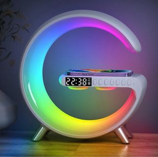 Lámpara de Mesa Inteligente Luz Led, Altavoz Bluetooth, Cargador Inalámbrico, Despertador, Control por aplicación Cargador rápido de 15 W con un cargador inalámbrico rápido de 15 W. Puede usar esta lámpara en cualquier lugar donde necesite cargar su teléfono móvil, etc. como la cabecera, el dormitorio, la sala de estar, el hogar y la oficina. Esto es realmente práctico. Luz de ambiente regulable Haga clic en el botón de la bombilla para cambiar 10 modos de color de luz :color sólido, caballo de carreras bicolor, caballo de carreras tricolor y caballo de carreras de siete colores Los otros 256 modos y 16 millones de colores de luces!