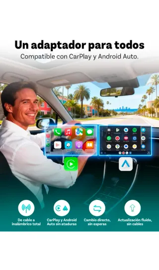 Ottocast Mini Pico, Novedad 2026, Adaptador inalámbrico 2-en-1 CarPlay Android Auto, Cambio de Dispositivo con un Toque, Plug & Play, WiFi 6 y Bluetooth 5.4, Conexión automática para iPhone y Android Adaptador compacto de color negro y gris con un logo azul. - Diseño moderno y minimalista. - Botón lateral. - Conector USB plateado.