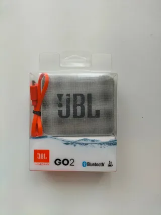Altavoz portátil JBL GO 2 en color gris con detalles en naranja. Incluye cable de carga. - Conectividad Bluetooth. - Diseño compacto y resistente al agua.