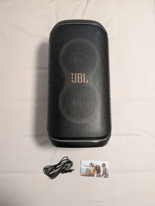Altavoz portátil sin usar, listo para disfrutar de tu música. - Incluye cable cargador. - Diseño moderno y funcional.
