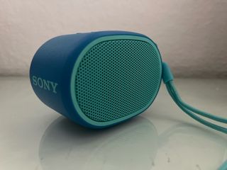 Altavoz portátil de la marca Sony en color azul. - Diseño compacto y moderno. - Rejilla frontal para el altavoz.