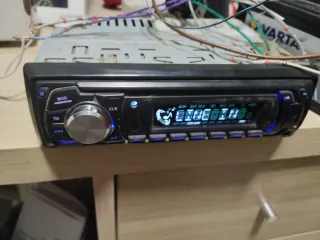 Radio para coche con múltiples opciones de conexión. - Conectividad Bluetooth para llamadas y música. - Puerto USB para reproducir archivos. - Entrada auxiliar (AUX) para otros dispositivos. - Diseño moderno en negro y plata.