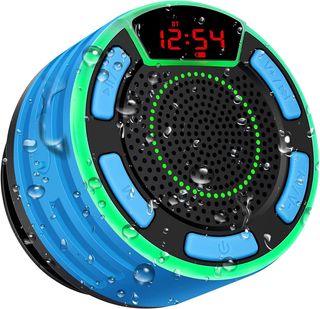 Altavoz portátil con diseño moderno y resistente al agua, ideal para usar en la ducha o exteriores. - Conectividad Bluetooth. - Diseño cilíndrico con detalles en verde y azul. - Botones de control de fácil acceso.
