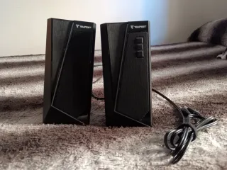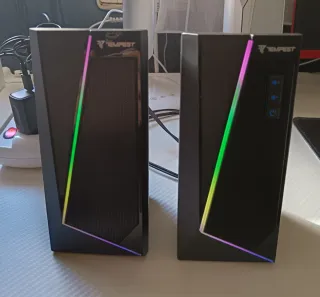 Altavoces de ordenador Tempest con conexión Bluetooth y luces RGB. Su precio de mercado nuevos es de 20-25€ - Color negro. - Iluminación LED multicolor (se puede cambiar el color de forma táctil en la parte superior y también apagarlas) - Conexión Bluetooth. - Buena calidad de sonido. ⚠️Importante⚠️ Cuando alcanzan un volumen muy alto suena un pequeño pitido. Mientras se escucha música es casi imperceptible, pero si no se están usando hay que bajar el volumen para que no se oiga. Por lo demás están perfectos. Las luces también funcionan bien y son muy bonitas.
