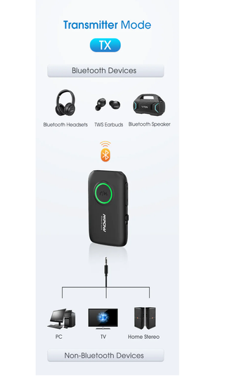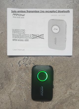 Dispositivo MPOW BH390B para emitir/transmitir audio de forma inalámbrica. Baja Latencia APTX. Transmisión de audio sin retraso. TX mode = MODO EMISOR/TRANSMISOR. (RX mode = MODO RECEPTOR NO DISPONIBLE). No funciona como receptor de audio. Incluye el manual de usuario.