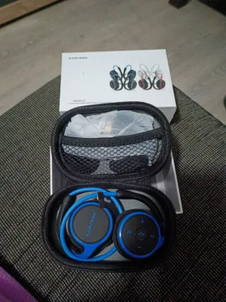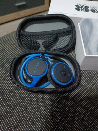 Auriculares inalámbricos de la marca Kamttron en color azul y negro. Se entregan en su funda protectora. - Diseño plegable. - Incluye funda de transporte.