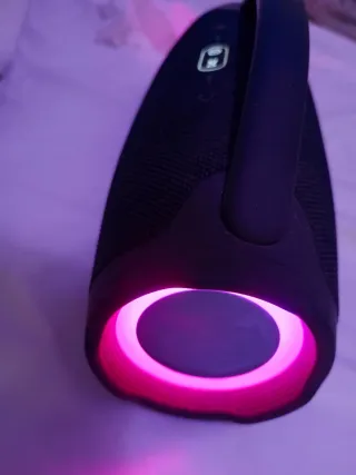 Altavoz portátil con luces LED. - Diseño cilíndrico. - Base azul con detalles. - Luces LED que cambian de color. LO VENDO POR FALTA DE USO FUNCIONA PERFETAMENTE
