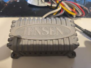 Amplificador Bluetooth Jensen en color gris. Diseño compacto y robusto. - Carcasa de metal con aletas de refrigeración. - Logotipo de Jensen grabado en relieve.