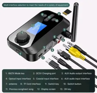 Adaptador de audio Bluetooth multifunción VAORLO C41. - Es transmisor y receptor bluetooth para móviles, tablets, PC, TV, Altavoces, Equipo de Música, Reproductores, Amplificadores, Proyectores etc... - Con pantalla LED. Y a su vez es un DAC para PC, TV, PS4, BOX, Sistemas de Audio, Proyectores etc... ⁃ Funciones de transmisor y receptor Bluetooth. ⁃ Conexiones óptica, coaxial y auxiliar jack 3.5mm. ⁃ Incluye antena y ranura para tarjeta TF. ⁃ Control de volumen y selección de pistas. - Incluye Cable de corriente Usb, Cable Optico y Cable de audio Jack 3.5mm. Distancia de transmisión: 10 Metros. NUEVO