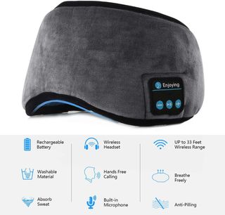 Antifaz para dormir con tecnología Bluetooth integrada y auriculares. - Batería recargable. - Material lavable. - Absorbe el sudor. - Auriculares inalámbricos. - Llamadas manos libres. - Micrófono incorporado. - Alcance inalámbrico de hasta 10 metros. - Transpirable. - Anti-pilling.