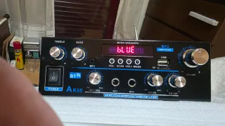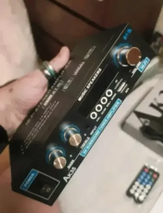 Amplificador de audio AK35 de 800W de potencia máxima (400w-+400W. - 40W+40W RMS) en perfecto estado. ⁃ Funciona con Bluetooth y tiene control de baios y agudos. - Tiene radio FM ⁃ Incluye mando a distancia. ⁃ Potencia máxima de 800W (400w+400w = 40w+40w RMS). ⁃ Conectividad Bluetooth. ⁃ Control de bajos y agudos. ⁃ Entradas de Micro + USB + TF/SD ⁃ Impedancia: 4/16 Ohmnios. ⁃ Frecuencia: 10Hz -20KHz. - Voltaje: 110v/220v. Se puede conectar a Equipos Estéreos, al Coche, Televisores. Ordenadores de Mesa y Portátiles, Reproductores Mp3 y DVD, Proyectores con audio AV etc... "Probado, con soporte técnico y la garantía de un experto",