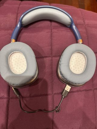 Auriculares inalámbricos con un diseño moderno y elegante. Se usaron una vez. No tengo la caja - Conexión Bluetooth. - Acabado plateado brillante. - Diadema azul acolchada.