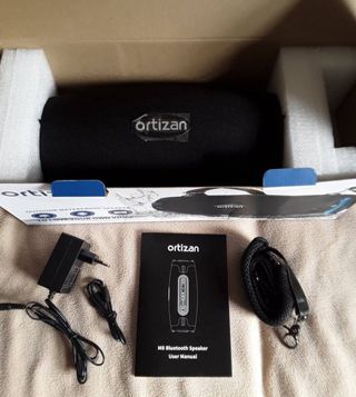 Altavoz portátil MOB, vino de regalo, quitado de la caja para comprobar estado. Tiene entrada auxiliar, y para tarjeta. Incluye manual de usuario y cable de carga.