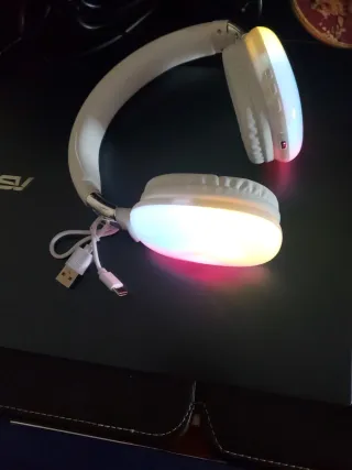 Cascos de diadema con conexión Bluetooth y luces LED. - Abierto para comprobar funcionamiento - Diseño moderno y llamativo. - Banda ajustable para mayor comodidad. - Incluye cable de carga USB.