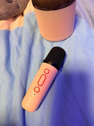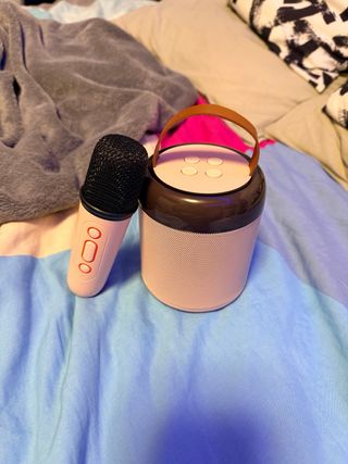 Altavoz Bluetooth con micrófono para karaoke, ideal para niños. Tiene un diseño moderno y es fácil de transportar. - Asa de transporte. - Botones de control en la parte superior. -No viene con cargador -Se carga con tipo C (el micro y el altavoz)