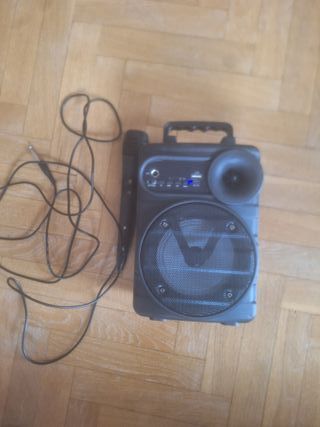 Sistema de karaoke VOZKOM KM40 con dos micrófonos incluidos. Ideal para animar tus reuniones. - Incluye dos micrófonos. - Diseño portátil con asa. - Conexión para carga.