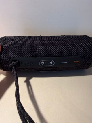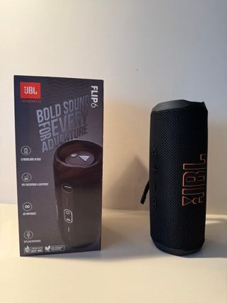 Altavoz portátil JBL Flip 6 en color negro con detalles en naranja. Ideal para llevar a todas partes. - Resistente al agua y al polvo (IP67). - 12 horas de reproducción continua. - Función PartyBoost para conectar varios altavoces. - Micrófono integrado para llamadas.