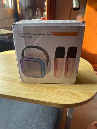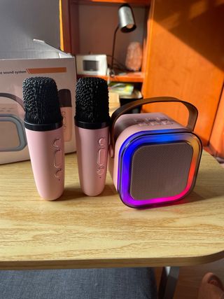 Sistema de karaoke portátil K12 en color rosa y dorado. Incluye dos micrófonos inalámbricos. Es un equipo compacto y ligero, ideal para fiestas y reuniones. - Sistema de sonido portátil. - Incluye dos micrófonos. - Diseño elegante y moderno.