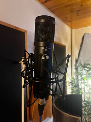 En perfecto estado condensador para voces guitarra percusión no tiene nada calidad profesional con botón para recorte de graves y otro botón para -20 de ganancia para grabar percusion guitarras etc muy poco uso funciona perfectamente