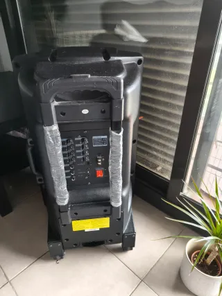 Altavoz portátil con ruedas y asa extensible para facilitar su transporte. Cuenta con luces LED de colores. - Diseño robusto y moderno. - Asa extensible. - Ruedas para movilidad. - Control remoto y micrófono.