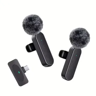 Set de micrófonos inalámbricos para creadores de contenido. Incluye dos transmisores y un receptor. - Diseño compacto y ligero. - Clip para sujetar a la ropa. - Cubierta de pelo para reducir el ruido del viento.