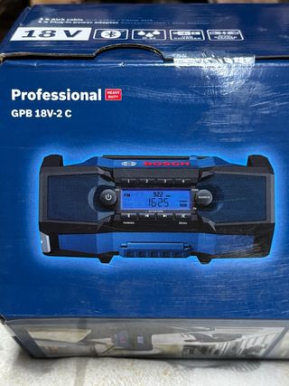 Radio profesional Bosch GPB 18V-2C. - Diseño robusto y compacto. - Conexión Bluetooth. - Entrada auxiliar (AUX). - Resistente al agua y al polvo (IP 54). En su caja original. Precintada.