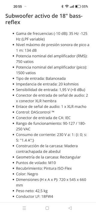 subwoofer D.A.S Action S18a entrega una potencia de 134 decibelios datos técnicos en la segunda foto.(no leer sub graves altavoces fiesta bodas