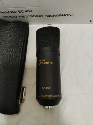 Micrófono de condensador profesional the t.bone SC 400, ideal para grabaciones en estudio. - Modelo: SC 400 - Tipo: Micrófono de condensador - Uso: Grabación de estudio Diafragma de oro de 1" chapa Patrón polar: Supercardioide Respuesta en frecuencia: 50 - 20000 Hz Requiere alimentación fantasma de 48 V Dimensiones con la suspensión (diámetro x alto): 44 x 150 mm Incluye suspensión y estuche blando OFERTA: Por 10€ mas, te llevas soporte Audiobax Podcast/Studio Kit. (También en la foto)