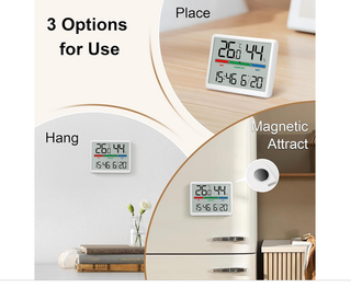 Mejora tu hogar con este despertador digital LCD 4 en 1: hora, fecha, temperatura y humedad. Incluye termómetro interior e higrómetro para controlar el clima real de la habitación y conseguir un ambiente saludable. Ideal para dormitorio, cocina, oficina, estudio o habitación infantil. Diseño compacto con 3 opciones de instalación: colgar, imantar o colocar en mesa. Lectura clara, funcionamiento sencillo y bajo consumo. Perfecto para medir humedad en casa, vigilar temperatura y usar como reloj despertador diario. Totalmente nuevo y sin uso.