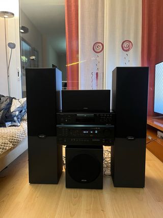Equipo de cine en casa 5.1 en buen estado. Se incluye un amplificador Onkyo TX-SR502E, dos altavoces de suelo Polk Audio R30, dos altavoces de estantería Polk Audio R15, un altavoz central Polk Audio CSi25, un subwoofer Jamo E3Sub y todos los cables necesarios. Los componentes presentan un aspecto elegante y están muy bien cuidados.