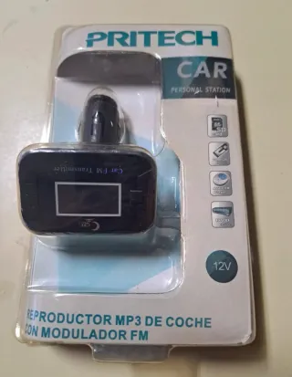 Reproductor MP3 para coche con transmisor FM. - Compatible con tarjetas SD. - Funciona a 12V. Reproductor MP3 de coche PRITECH, totalmente nuevo. Se quedó guardado en una caja después de una mudanza y nunca lo llegué a usar. Tengo otro igual instalado en mi coche y funciona de maravilla. Incluye mando a distancia y funciona a 12V. No tiene Bluetooth, pero es perfecto si sueles usar música en MP3, tarjeta SD o USB. Reproduce MP3, MP4, tarjeta SD y USB Compatible con PC, Macintosh, notebook, móvil Envío por cualquier medio pero no quedo en persona