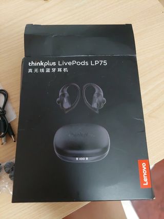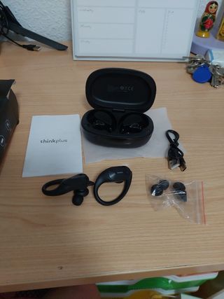 Auriculares inalámbricos Lenovo en color negro. Los vendo por qué me quedan grandes y se me caen - Cable de carga USB. - Almohadillas de repuesto. Se escuchan perfectamente y cargan bien.