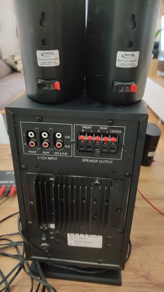 Sistema de sonido envolvente para una experiencia de cine en casa. - Incluye subwoofer y 5 altavoces. - Mando a distancia para control total. OJO, hay dos altavoces sin los cables por que se quedaron dentro de la canalización para este fin, se pueden instalar fácilmente un cable de audio para ellos.