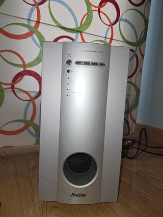 conjunto de altavoces 5.1, tal cual se ve en la foto, con algún pequeño deterioro del paso del tiempo, el sonido es bueno. Se vende porque no lo usamos y queremos quitarlo del mueble.