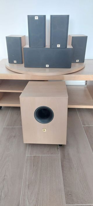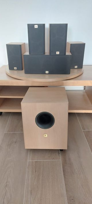 Estupendo sistema de sonido marca JBL para sistema 5.1. Inluye 5 altavoces satélite y un subwoofer de madera en tonalidad abedul. Sonido envolvente de alta calidad con el plus que aporta la madera en la transmisión del sonido Perfecto para escuchar música y para home cinema. Diseño elegante