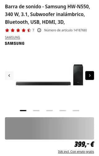 Barra de sonido - Samsung HW-N550, 340 W, 3.1, Subwoofer inalámbrico, Bluetooth, USB, HDMI, 3D Esta barra de sonido te da una experiencia de audio espectacular y realista que te hará sentir como en el mejor cine, incluso con películas en 3D. Gracias a su tecnología Dolby Digital, la barra reproduce automáticamente sonido detallado y de alta calidad al conectarse con el televisor. Además, cuenta con el modo Surround Sound Expansion, que crea un efecto de sonido envolvente sin necesidad de altavoces adicionales.Compatible con Kit Surround SWA-8500S