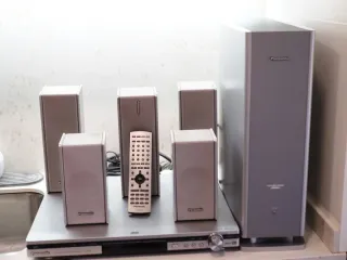 Sistema de cine en casa Panasonic con DVD y altavoces. - Receptor AV. - 5 altavoces satélite. - Subwoofer. - Mando a distancia.