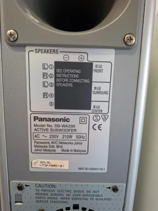 Sistema de cine en casa Panasonic. - Incluye reproductor de DVD. - Altavoces satélite. - Subwoofer.