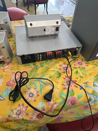 En venta, amplificador Onkyo TX-SR607E en color gris plata. Se encuentra en buen estado. - Incluye un amplificador Onkyo TX-SR607E y tres altavoces Bose bidireccionales - Dispone de múltiples entradas y salidas de audio y vídeo. - Amplificador de sonido envolvente.