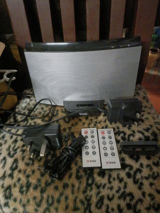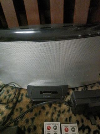 6 altavoces, Subwoofer, ecualizador, 80 w. USB para pendrive. Radio AM/FM. Base soporte para iPods, Apple